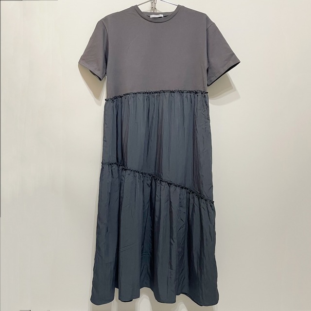 異素材をドッキングしたワンピースです。