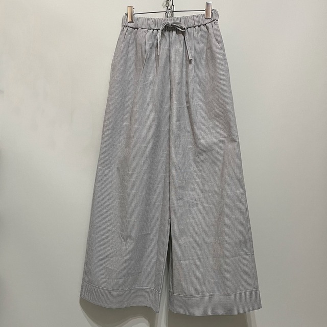 細ストライプ生地のワイドパンツ。