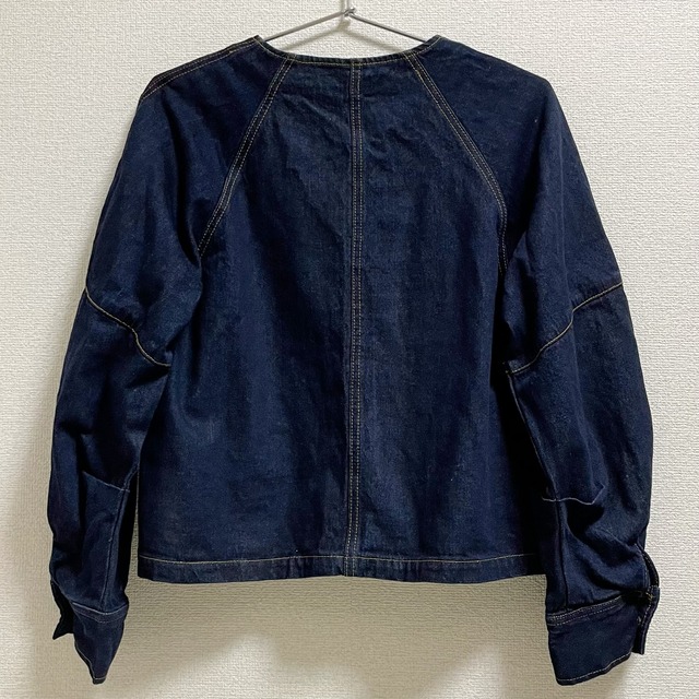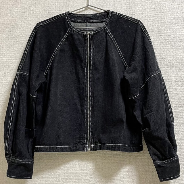 ノーカラーのデニムブルゾン。